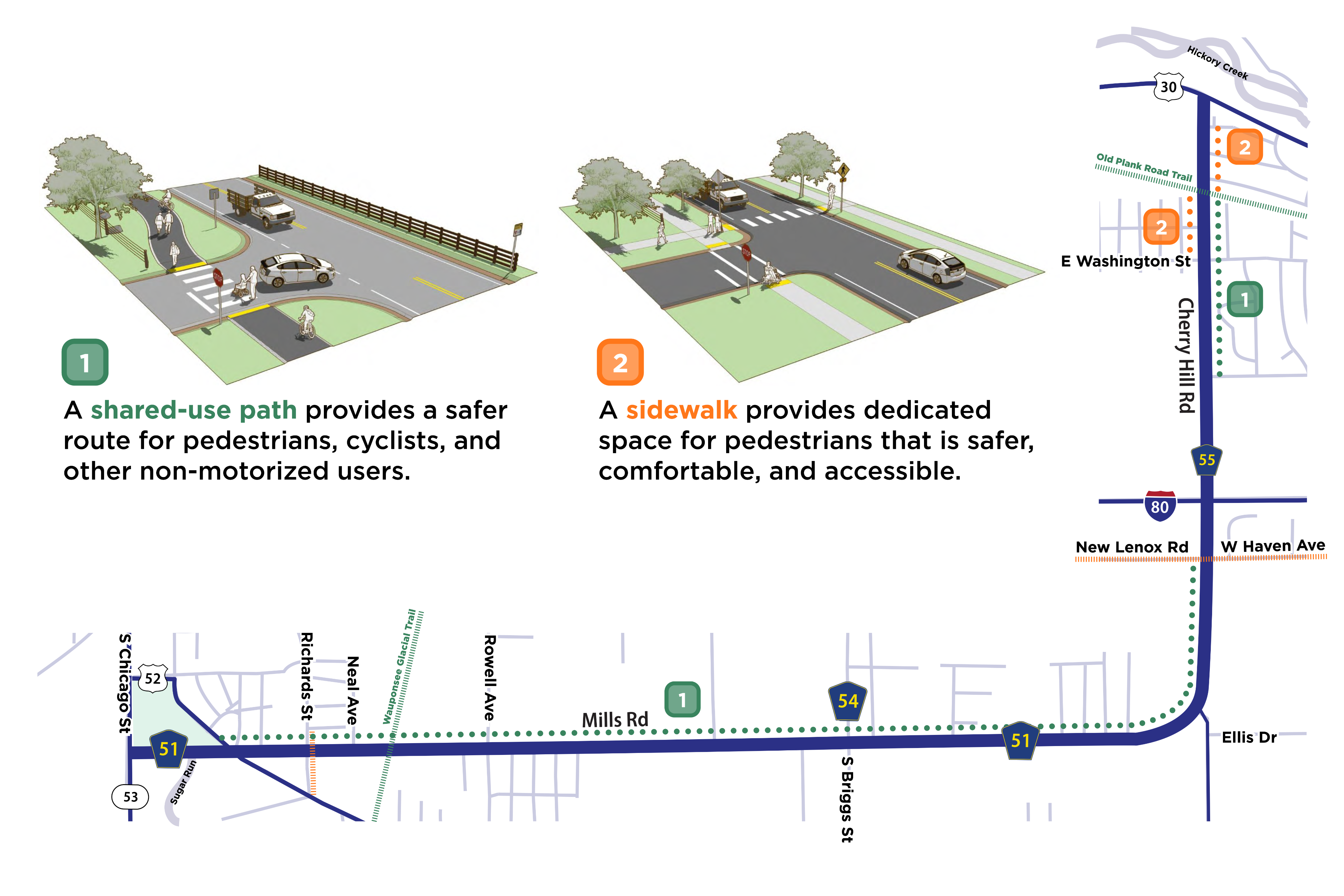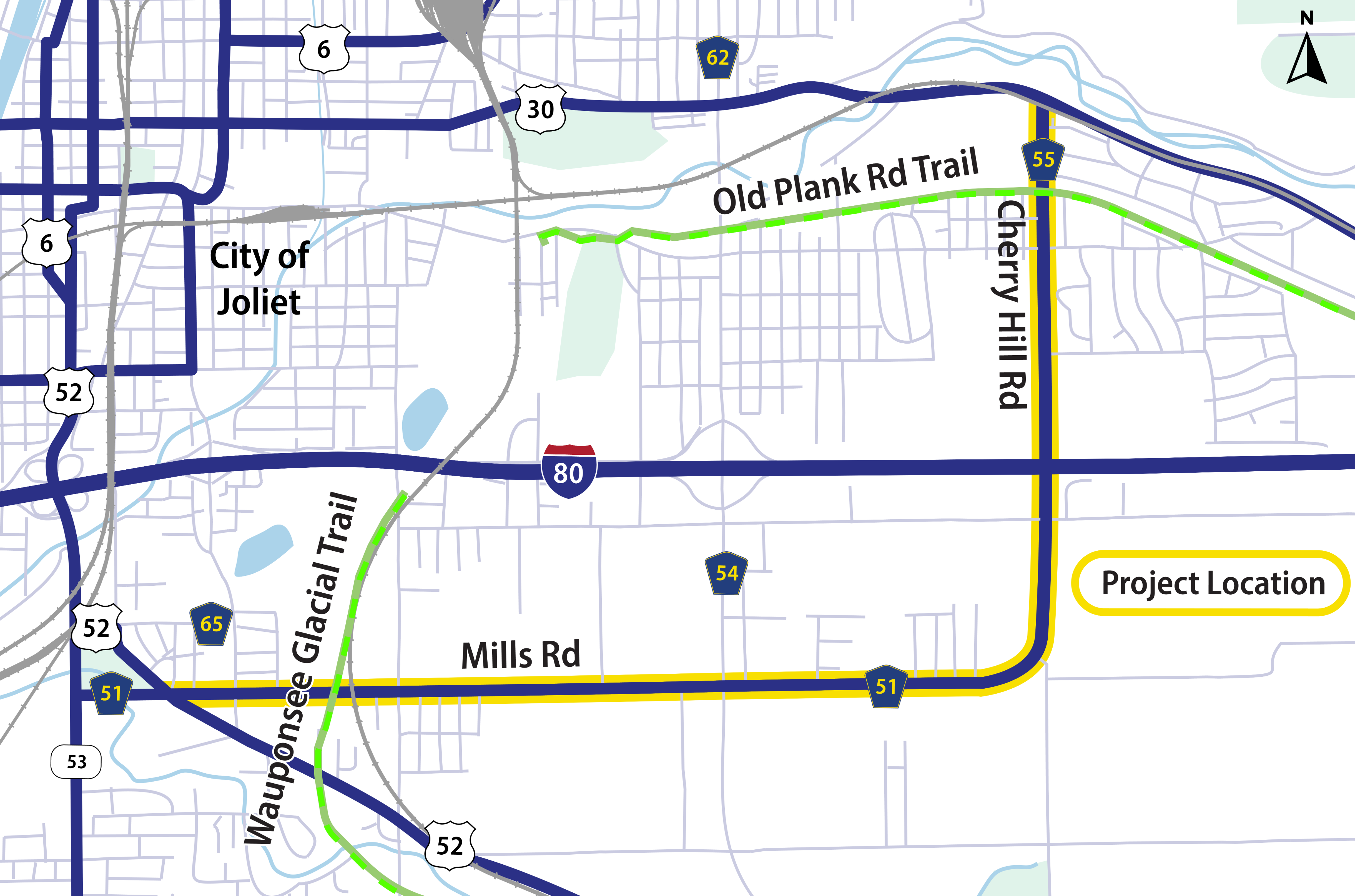 This Phase I Study assessed Mills Road and Cherry Hill Road from U.S. Route 52 to U.S. Route 30, which includes portions of unincorporated Will County, the Village of New Lenox, and the City of Joliet.